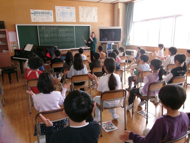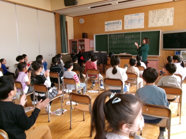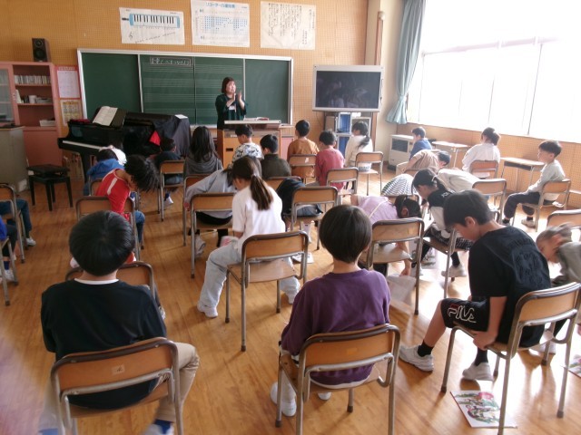 音楽の授業が本格的に始まりました。きょうは、リズム打ちです。だんだん難しくなりましたが、子供たちは真剣に正しいリズムを打とうとしていました。