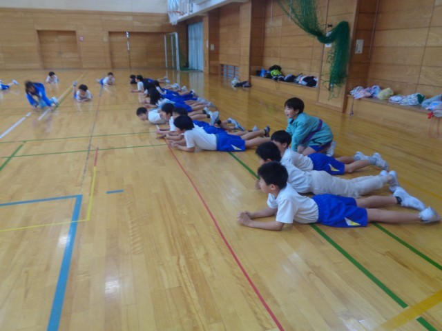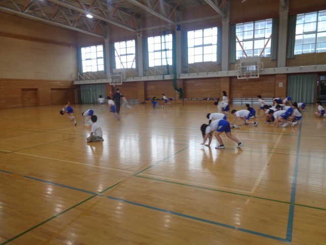 体育科では、本格的な運動に入る前に体をあたためるための運動を行っています。子供たちは楽しそうに活動を行っていました。