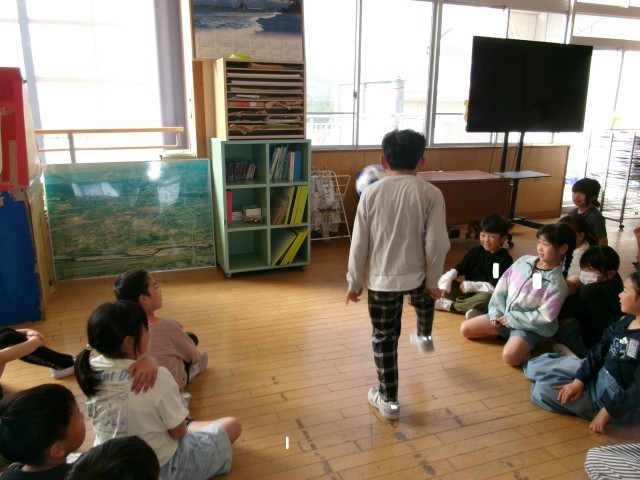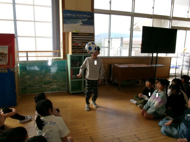 3年生の「ききあいタイム」では、時々実技的なものを入れて、友達の頑張りを認め合っています。これからうまくなりたいこと、今がんばっていること、得意になったこと、などの「自慢技」を披露して、その人の思いを話し合っています。今回は、ボールリフティングとミュージカルの英語の歌でした。