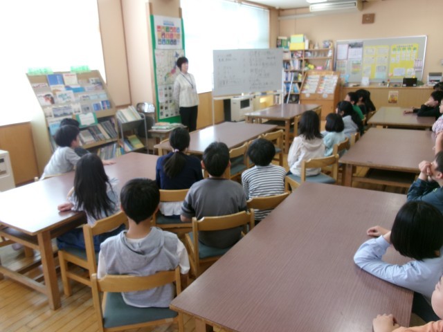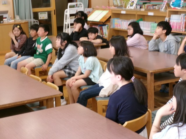 今日は図書オリエンテーリングとして、図書室の使い方や本の紹介をしていただきました。知っていることがほとんどでしたが、それでも真剣に話を聞き、興味をもって司書の先生の話を聞く姿勢が見られました。