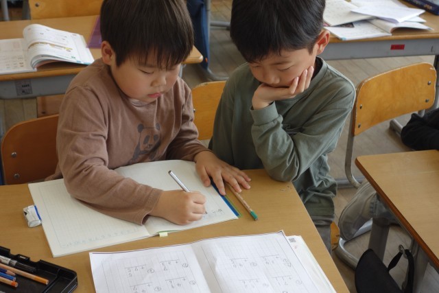 算数科の学習の様子です。ノートへの書き方、計算の仕方、繰り上がり…新しいことがたくさんですが、少しずつ慣れてきたようです。がんばろう、2年生!