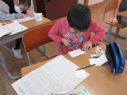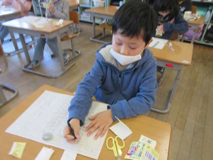 牛乳パックでつくる「パッチンガエル」の作り方を文で説明します。どんな書き方や言葉にすると分かりやすいのか考えました。実際に作りながら、一つずつ文を考えています。