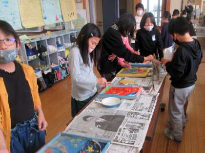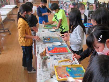 図工作品にニスで透明のコーティング。 塗装面を保護する目的でぬります。