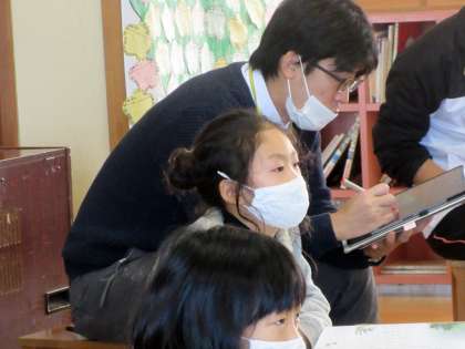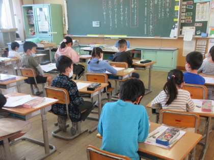 先生が勉強中のクラスの子供たちは、静かに自習に取り組んでいました。