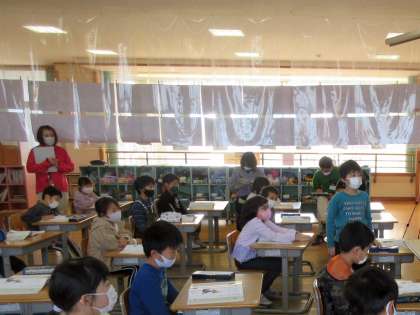 2年生の道徳の授業を、たくさんの先生が見ています。