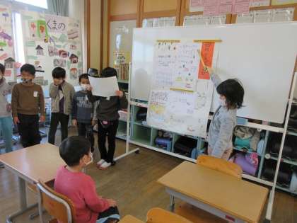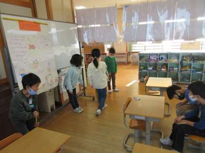 町探検の発表準備です。指し棒を使ったり、場所を移動してみたりして分かりやすく説明するための方法を考えています。