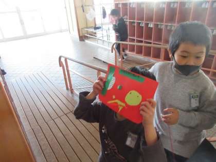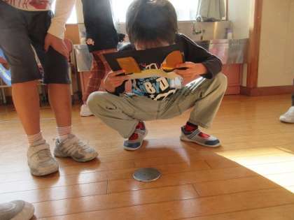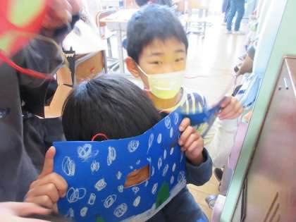 自分のカメラをつくったら、顔に見えるものを探しに校内を見て回りました。「床のところ顔に見える!」「下駄箱にもある!」と色々なところにある顔を探していました。