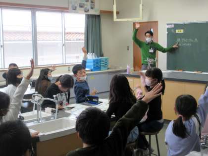 先生が手に持っているのは スチール缶とアルミ缶、黒板には木の文字もありました。