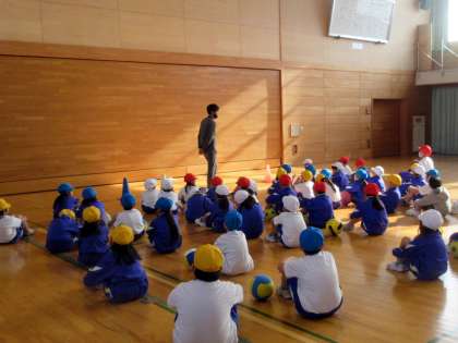 体育の学習中。 子供たちの聴く準備ができるのを待っています。