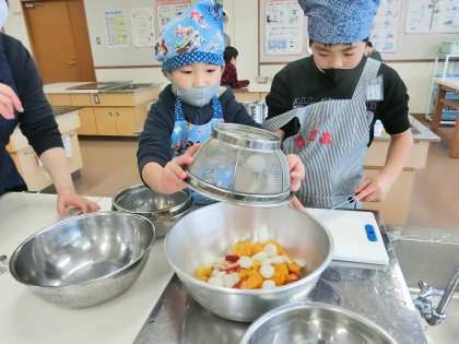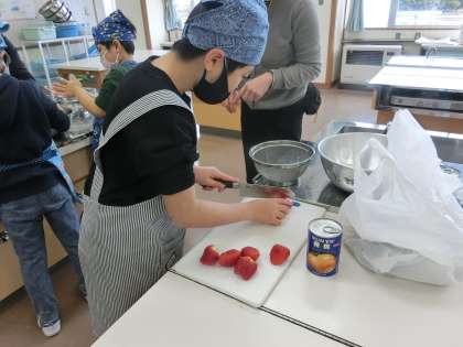 あおぞら級の子供たちは、久しぶりに学校で調理に挑戦です。作ったのはフルーツポンチ!!果物を切って、白玉団子を作って、ゼリーも作って・・・全部混ぜると、とてもおいしそうなフルーツポンチに仕上がりました。