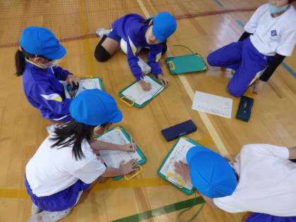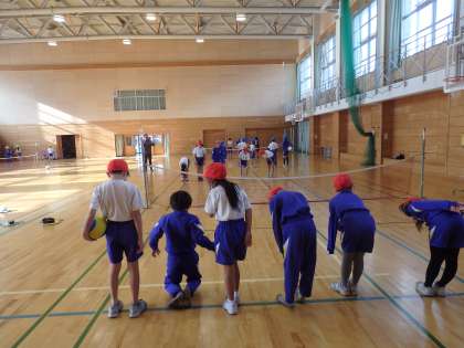 体育のバウンドバレーでは、1組対2組で色団ごとのリーグ戦をスタートしました。1列に並んで挨拶をしてから試合開始です。作戦を生かしながら、協力してがんばりました。準備や片付けも素早くなりました。