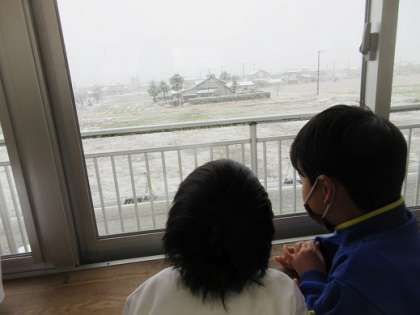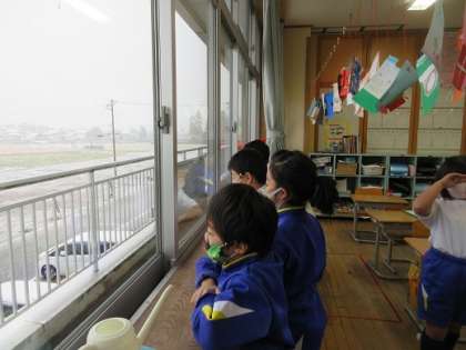 朝の会をしていると、降っていた雨が雪に変わってきました。久しぶりに見る雪に喜んでいる子供たちです。