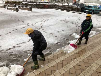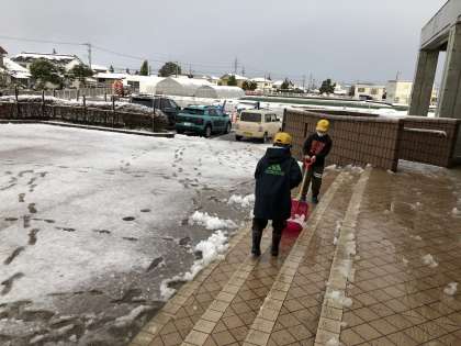 登校時の児童玄関前の様子です。児童玄関前に積もった雪を自主的に除雪してくれている宮野っ子がいました。「やってみようかな」という気持ちがすてきですね。