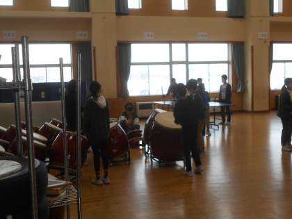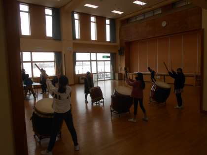 和太鼓の自主練習をする6年生たち。今週の木曜日に「大河」「大空」を4年生に披露することになっています。