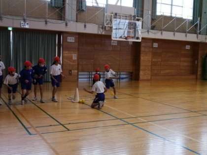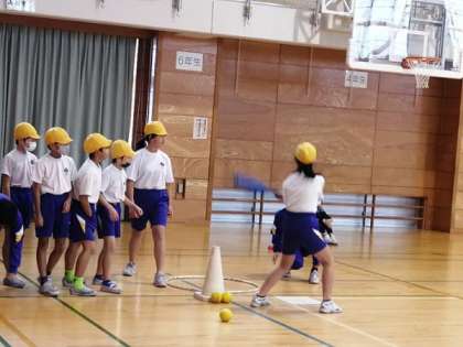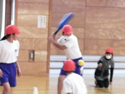 ベースボール型の学習では、バットで打つことに爽快感を感じます。今日は、少し太めのプラスチック製のバットを準備しました。普通のバットか太いバット、どちらを選ぶかは、自分の技能や好みに合わせて選択できます。前回までなかなか当たらなかった子供たちは、今日は気持ちよくバットを振っていました。次は、子供たちから提案された進塁について話し合う予定です。