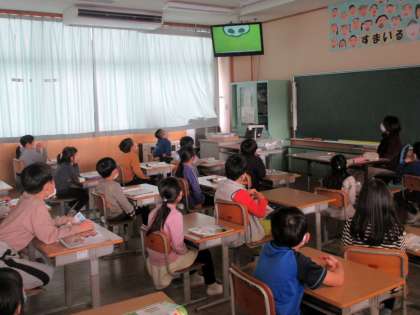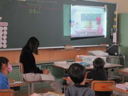 1組は「生き物」2組は「図書館」の放送を見ていました。