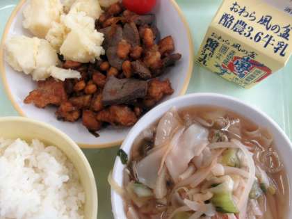 今日は鶏肉とレバーを使った「鶏肉とレバーの香味ソース」が給食にでています。