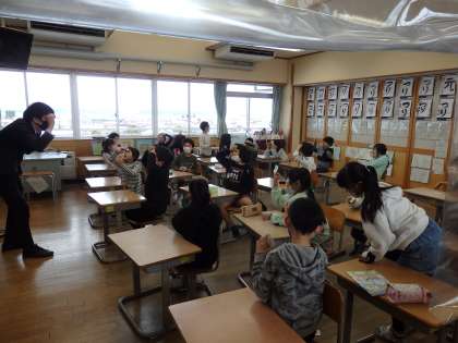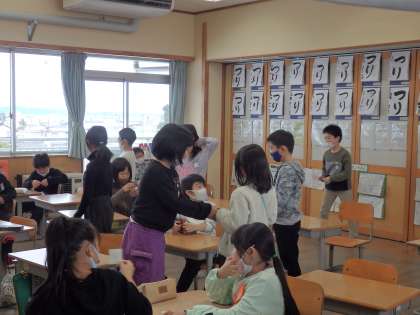 外国語活動では、一人一枚ずつカードを持ってゲームをしていました。