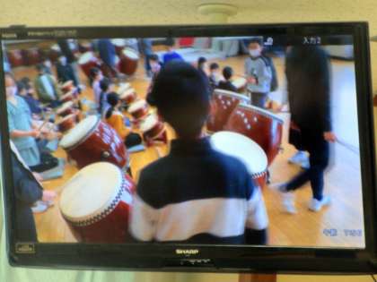 4年生や1年生に清流太鼓を伝えている6年生。