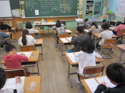 2年生は今年「はつ日」と書きました。2学期の書写の時間と冬休みの練習に一生懸命取り組んできた子供たち。一画一画集中して書いていました。