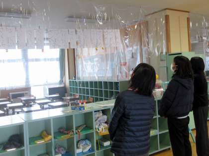 子供たちが帰った後、学年の先生たちが、書き初め作品の審査中です。