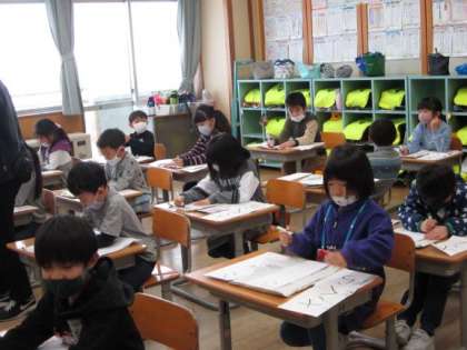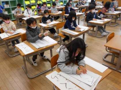1年生は初めての書き初め大会でした。冬休みの練習の成果を発揮し、真剣な表情で書いていました。
