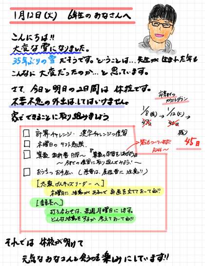 聞くところによると、地域の方がみなさんの通学路の除雪をしてくださっているそうです。先生たちも、学校周辺の除雪に取り組んでいます。こんな時に、地域の方のありがたさを身近に感じることも大切かもしれませんね。登校が再開した時には、感謝の気持ちを伝えられるといいですね。