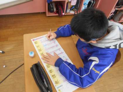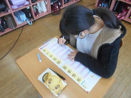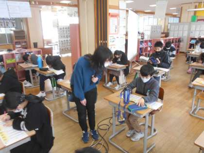 育休明けのH先生が、書写の時間に登場。3学期の書写を担当してもらいます。