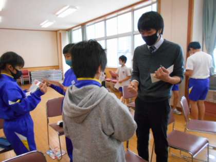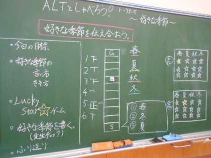 「ALTと話そう」のテーマのもと、本時は好きな季節について会話をする学習活動をしました。じゃんけんをして受け答え。楽しく進めています。