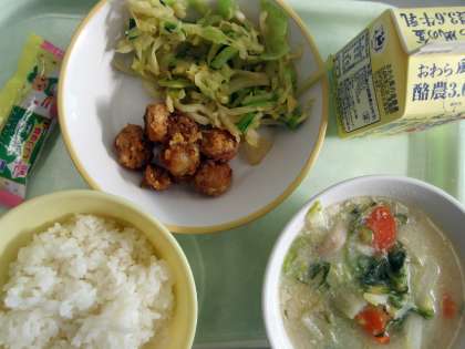 今日の「豆乳汁」には、豆乳のほか、鶏肉、にんじん、はくさい、しめじ、焼き豆腐、水菜、ねぎが入っているので、これだけで栄養満点です。