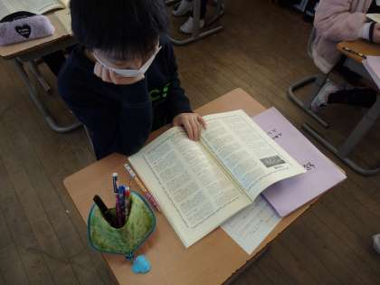 総合では、今までの宮野小学校のことを知るために、30周年記念誌や新校舎竣工記念誌などを読んでみました。今の校舎に変わった当時の写真や、その当時の児童の思い出などを見て、今との違いや同じところなどを見つけていました。