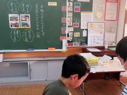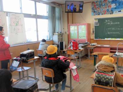 6年教室のテレビには、太鼓げんキッズの振り返りのためのビデオ。