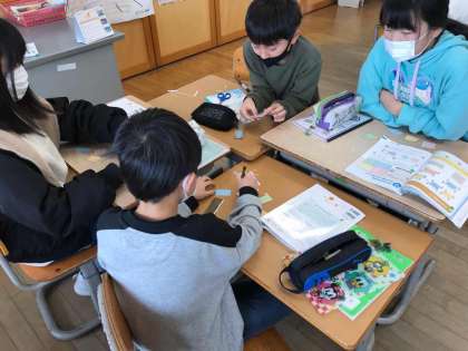 広さを比べる方法についてグループで話し合っています。直接重ねたり、マス目を引いたり工夫が沢山見られました。