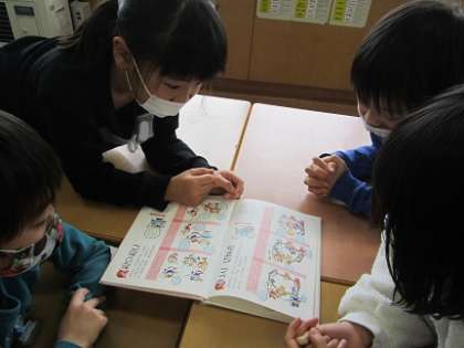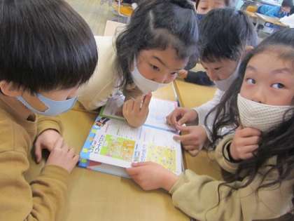 国語科「おにごっこ」の学習の中で、自分の知っているルール以外にはどんな種類の鬼ごっこがあるのかを本を使って調べました。