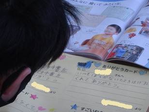 友達に「ありがとう」の気持ちを伝えるためのカードを書きました。分からない問題があったときやさしく教えてくれてありがとう、二重跳びのコツを教えてくれてありがとう、、、普段の生活の中でたくさんの「ありがとう」を見つけました。