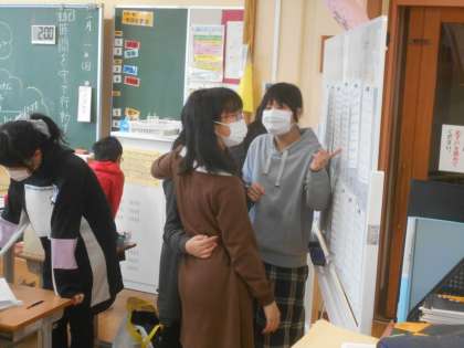 学年で演奏する合奏曲の楽譜を見ながら友達とどのパートにしようか相談中。