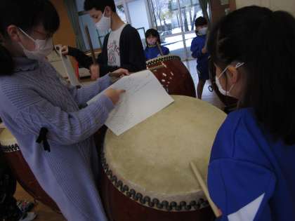 6年生の「まごころ」で、太鼓の楽曲「まごころ」をマンツーマンで何度も教えていただいている1年生。今日はさらに、分かりやすい手書き楽譜まで準備していただきました。すばらしいツールで、さらに太鼓のリズムが1年生の体と心に入ってきたようです。いつもありがとう、6年生さん。
