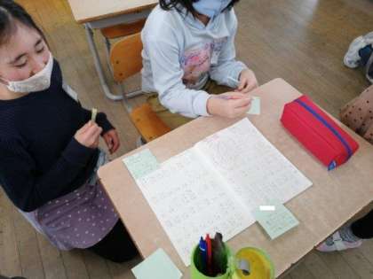 中学年で、「自学ノート交流会」を行いました。4年生は、3年生の自学ノートを見て「わー、すごい!がんばってるね。」「きれいな字!」などと、がんばりを認めながら付箋にコメントを書きました。また、3年生が自分の自学ノートを見て書いてくれた付箋を読み、「すごいですね!」「たくさん問題を解いていますね!」などの言葉に嬉しそうにしていました。今日見付けた友達の自学のよさを、明日からの家庭学習チャレンジ週間で取り入れることができるといいです。