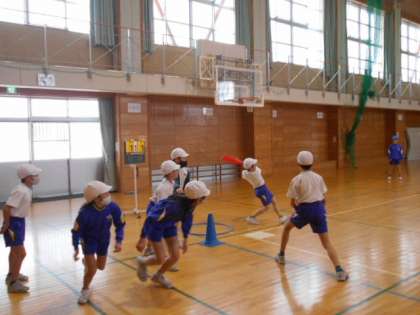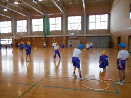 バットを持ってベースボール型のゲームに取り組んでいます。スイングにスピード感があります。