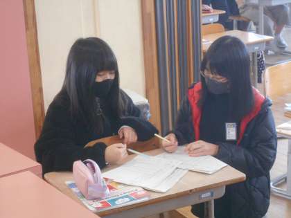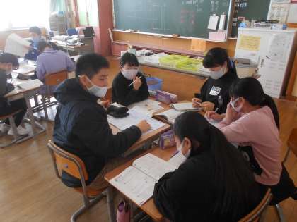 グループをつくり、ドリルや教科書を使って6年間の総復習を始めました。中学校に向けて、学びの土台をしっかり固められるようにします。