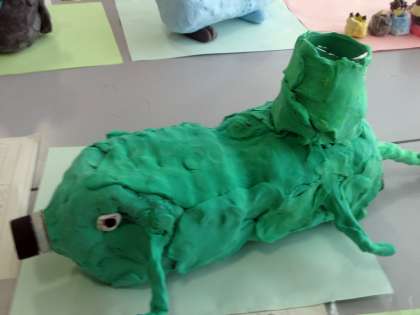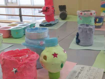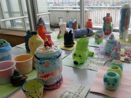 ペットボトルやプリンカップ等既存の容器を芯にして紙粘土で飾り付けます。