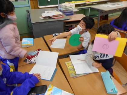 紙をかさねたり、はしを合わせたりしながら、どちらがひろいかをグループで話し合いました。