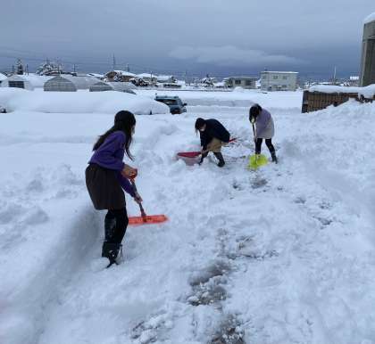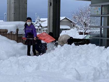 積雪がある中、頑張って登校してきた子供たちは、児童玄関前にたくさん雪があるのを見て「後から登校してくる人たちが大変な思いをしないように」と除雪を始めました。「友達に誘われて参加しました」「朝の会まで時間があるので」と理由は様々ですが、体をかけることを惜しまない子供たちの姿がありました。3年生と5年生が協力して除雪を行ったことで、児童玄関前に新たな道が開けました。これで、混雑を避けて下校できそうです。