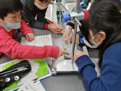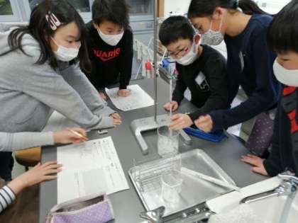 水が凍るのはどういうときだろう?温度は様子は?日頃の経験から予想を出し合い、実験に取り組みました。子供たちは、時間の経過と水の変化を細かく記録し、0度になると凍り始める様子や、完全に凍るとそれ以下の温度になること等、予想に反する初めての事象に驚いていました。