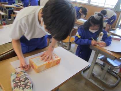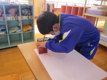 箱の面の数や形について調べました。画用紙に面を形取りながら調べていくと、「面の数がどの箱も6こになっている!」「長方形だけのもあるし、正方形だけの箱もある!」と様々なことに気づいていく子供たちです。