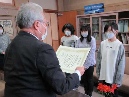 清流作文コンクールの入賞者への表彰式を行いました。個人賞の他、学校賞、学級賞もいただきました。