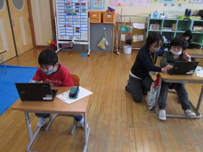 今日は、一人一台タブレットを使って、ビデオ会議(Meet)や写真撮影をしてみました。「ビデオ会議をすると、離れていてもみんなとつながるね。」、「次は、離れた場所でも話してみたいな。」楽しくタブレットを使って、学びたいと思います。