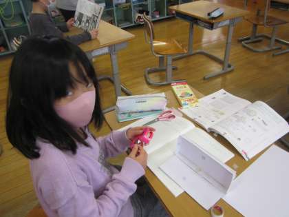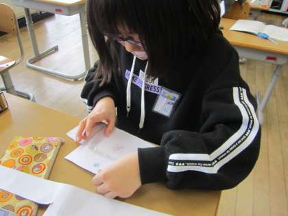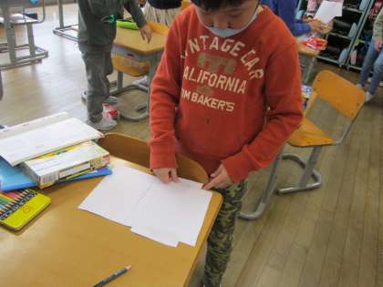 箱の面を画用紙に写し取り、面の部分だけを見てまた立体の箱を組み立てました。組み立てるときには、同じ辺の長さをつなぎ合わせることや向かい合う面は同じ大きさのものになっていないといけないことに気をつけて組み立てていました。