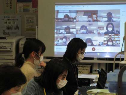 放課後、担任の先生たちが、タブレットを使ったビデオ会議研修を行いました。