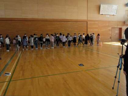 3年生が体育館でビデオ撮影中。